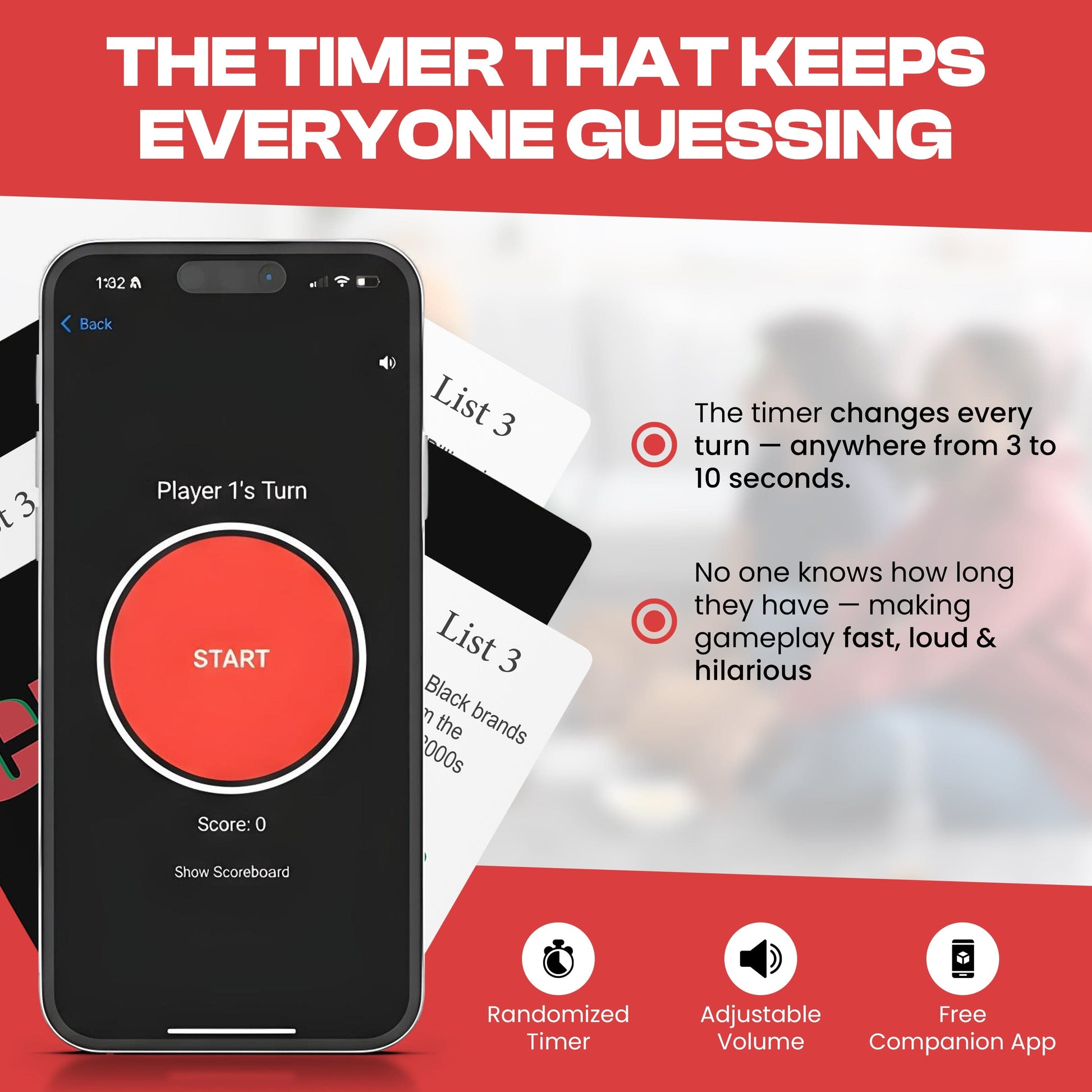 Every second counts in CP Time — and with the app, you’ll see and hear the unpredictable countdown like never before. The timer can go off at any moment between 3 to 10 seconds, so quick thinking is a must! The app adds a dramatic countdown, randomized timing, and a buzzer to raise the stakes and keep players on edge. Plus, it includes digital scorekeeping, Solo and Team Play modes, and even supports screen mirroring to your TV for group play.